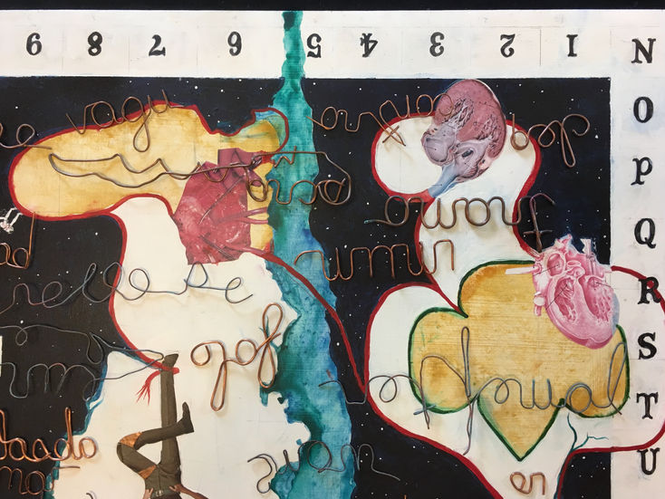 Layered over the collage are copper wire word fragments, indicating efforts at conversation and connection across a table.